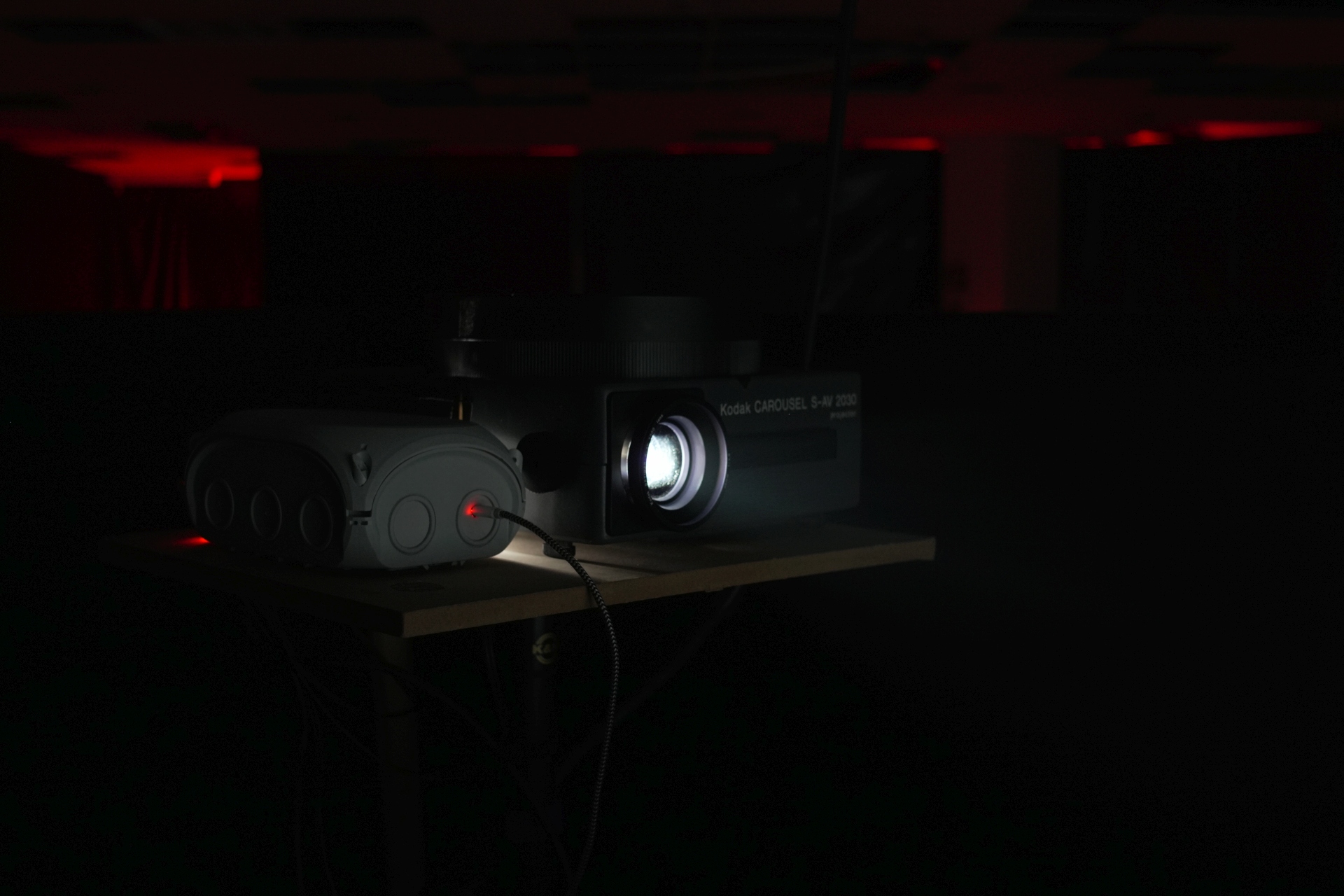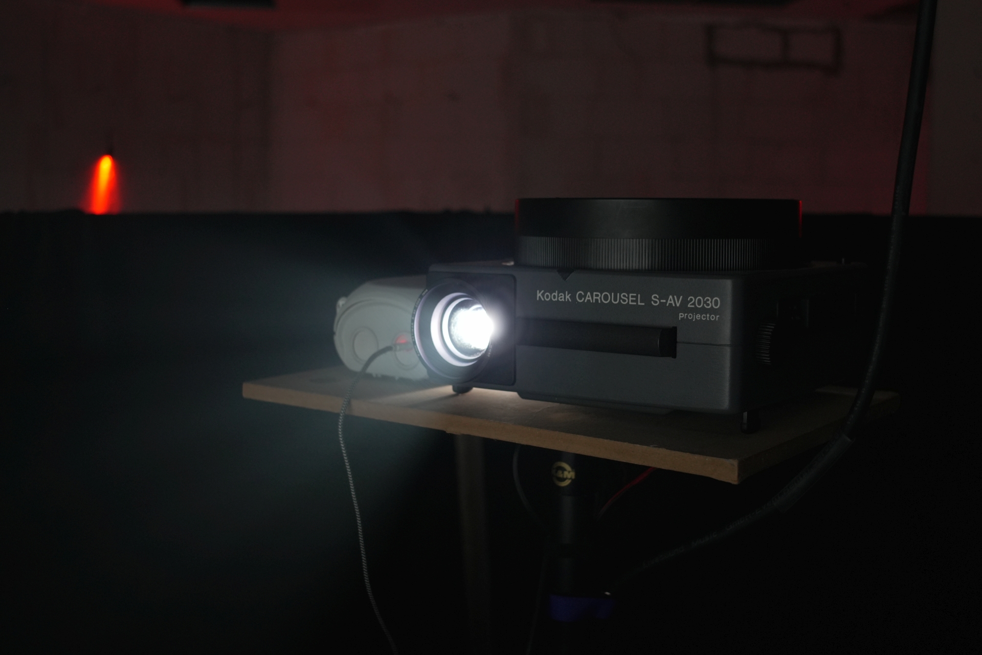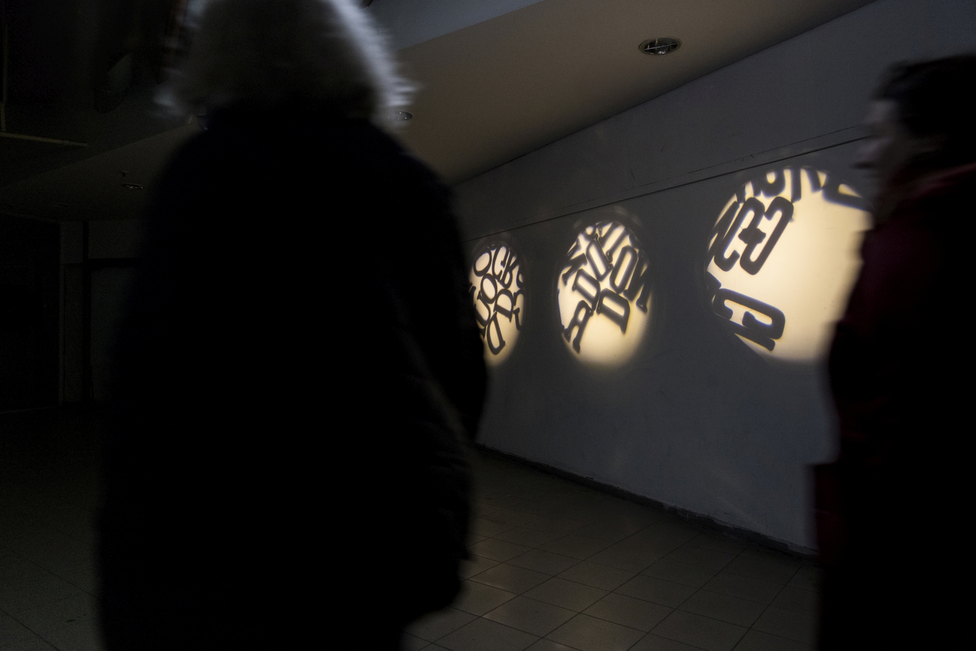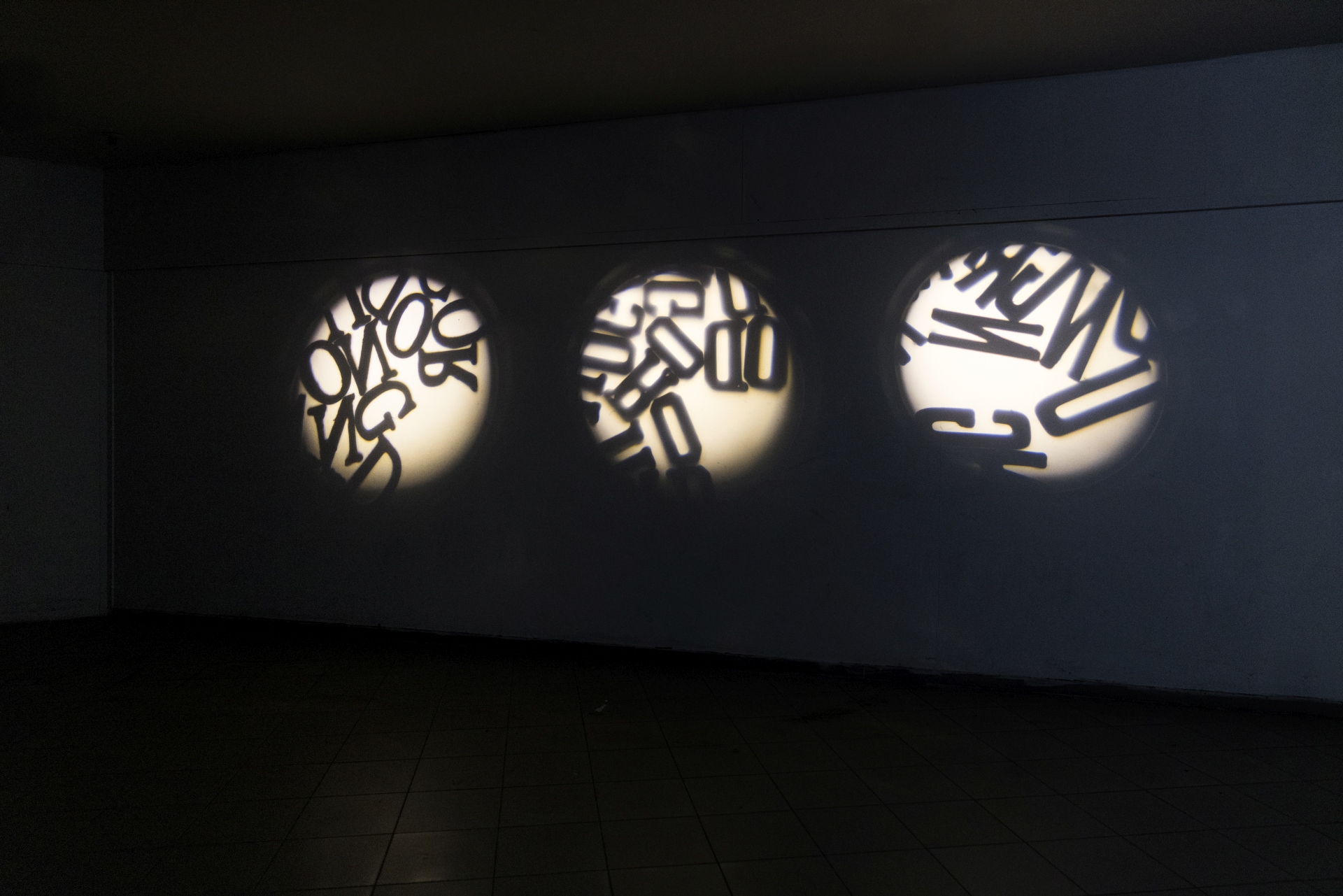 Visitors watch as three gobo projectors cast rotating capsules of letters onto a wall. The letters swirl unpredictably, much like the endless scroll of headlines in a media feed. At times they briefly align and suggest meaning; more often they remain ambiguous, reflecting the elusive nature of “ground truth” in a world saturated with updates.