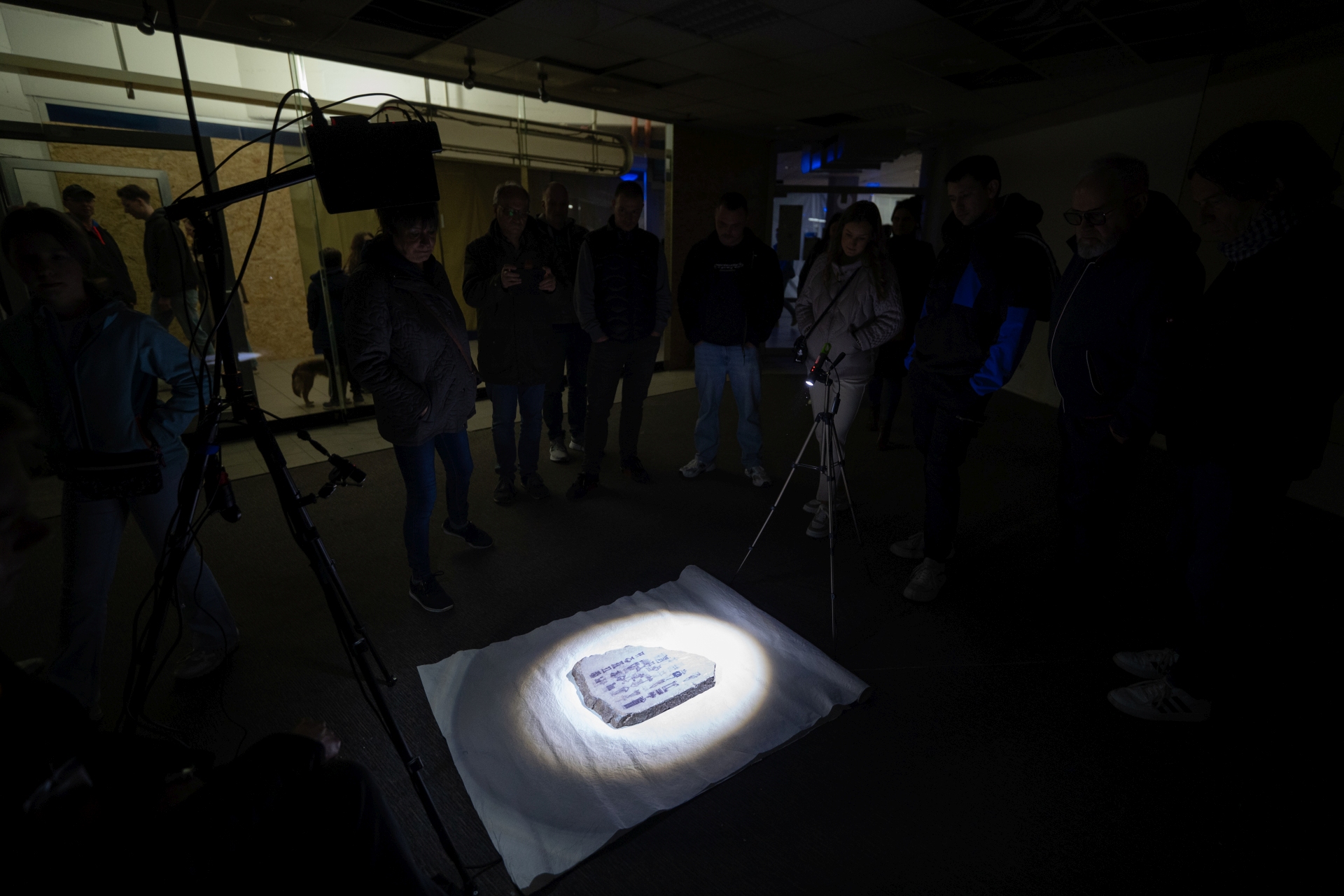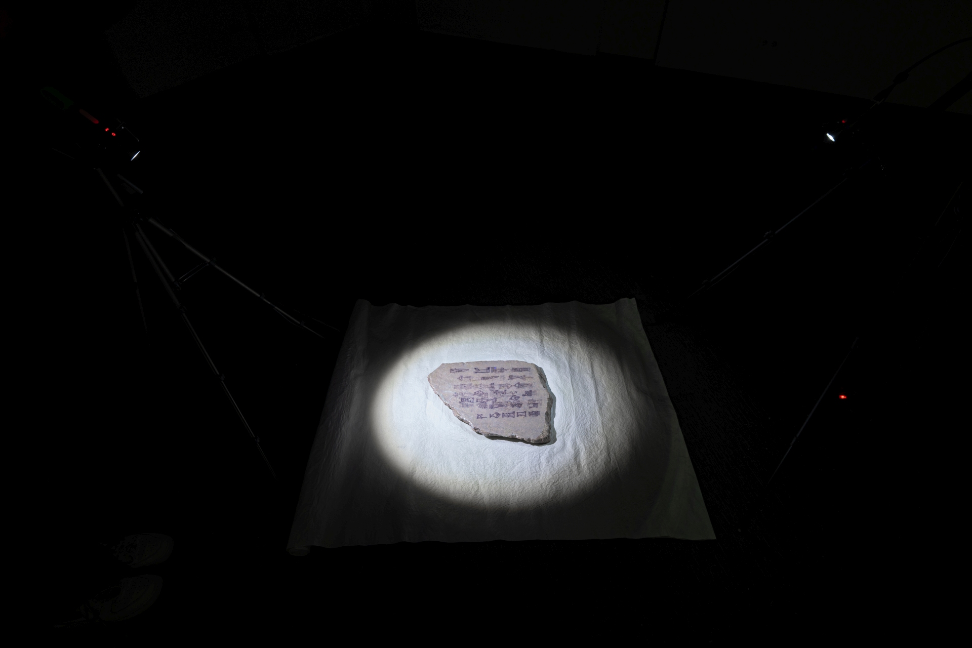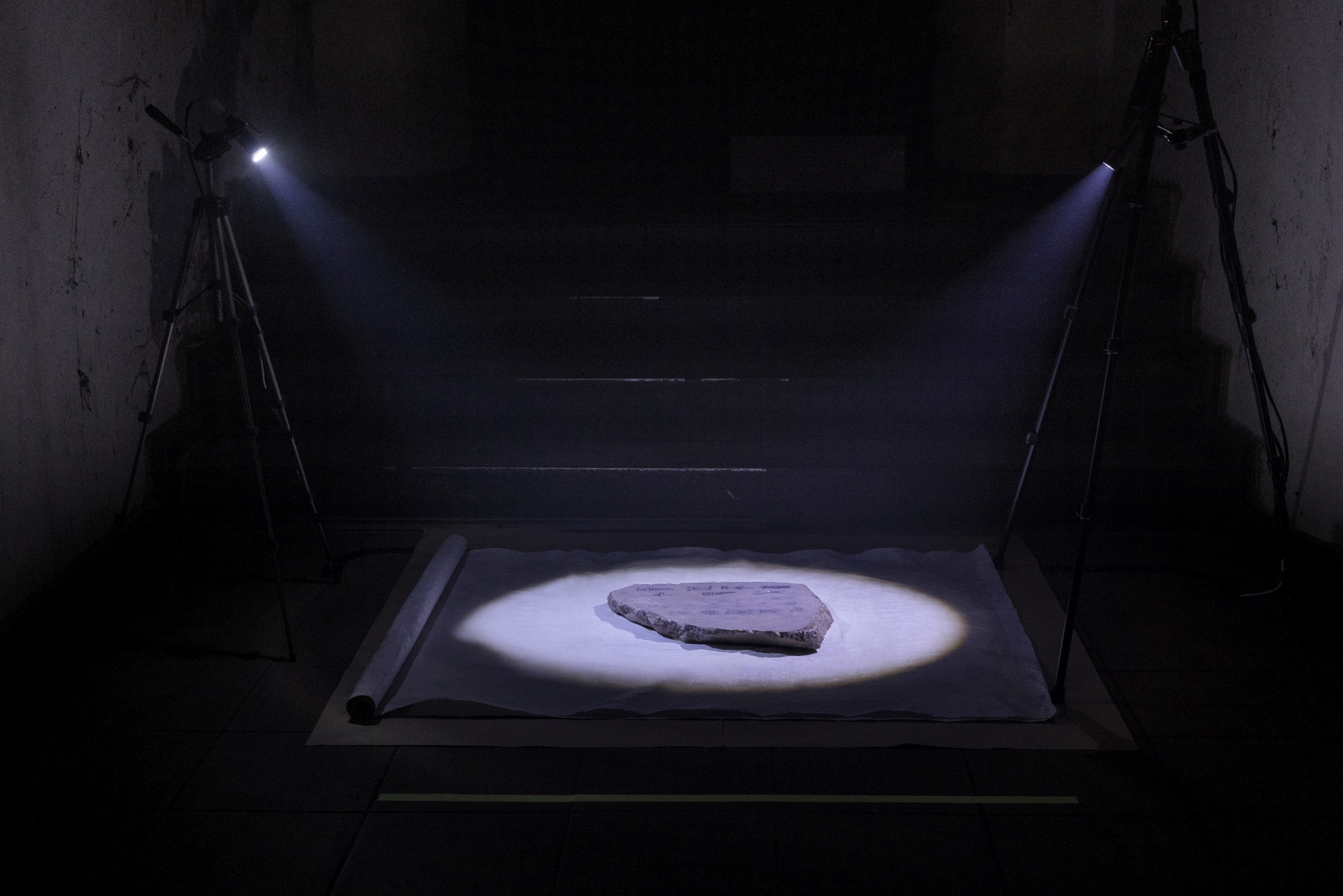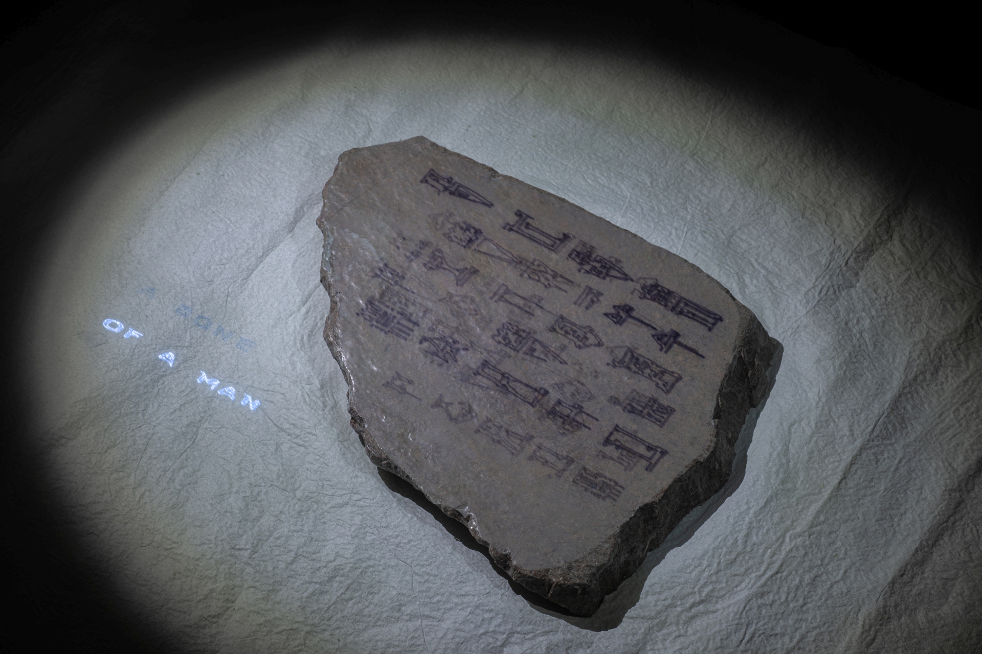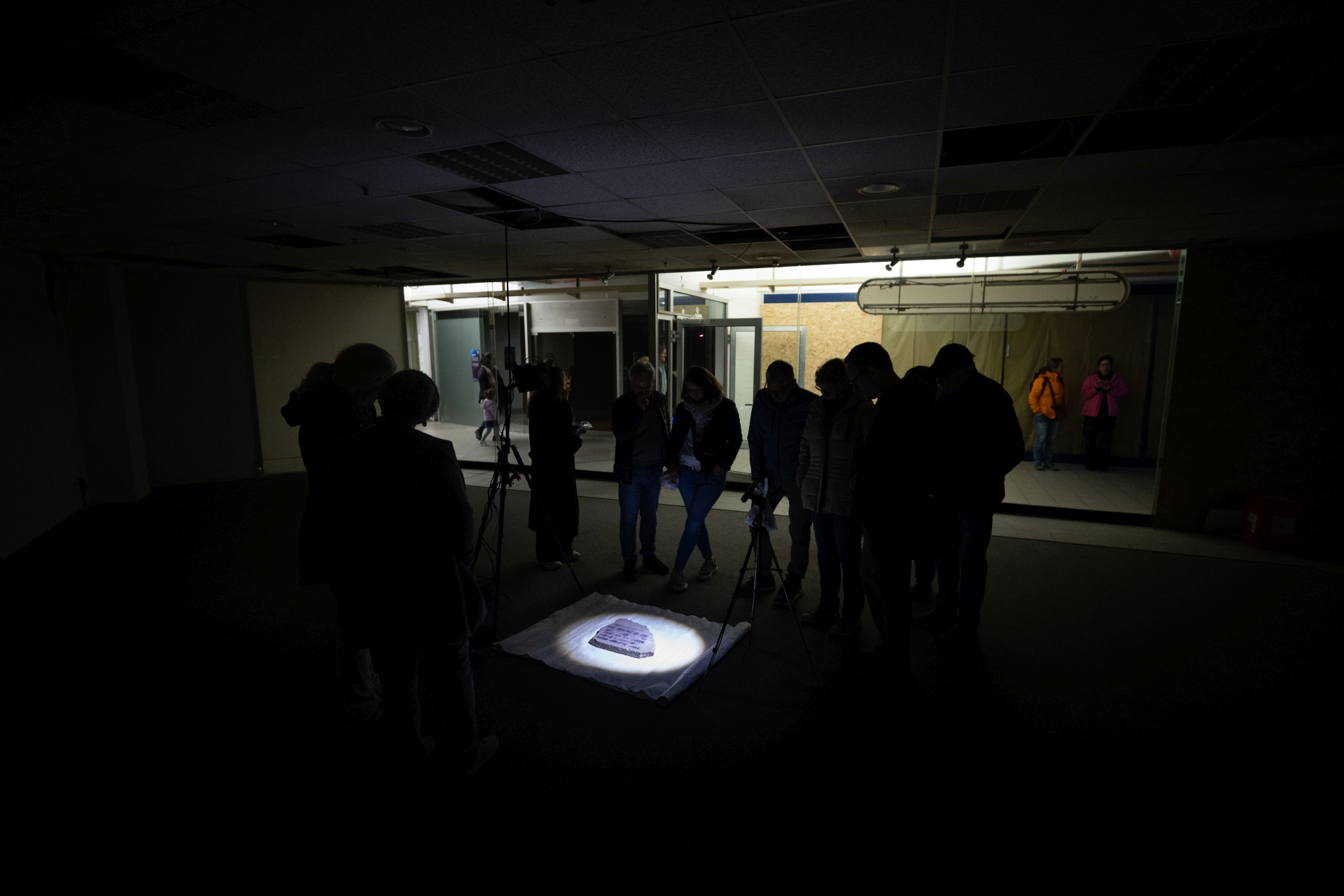 Visitors watch as three gobo projectors cast rotating capsules of letters onto a wall. The letters swirl unpredictably, much like the endless scroll of headlines in a media feed. At times they briefly align and suggest meaning; more often they remain ambiguous, reflecting the elusive nature of “ground truth” in a world saturated with updates.