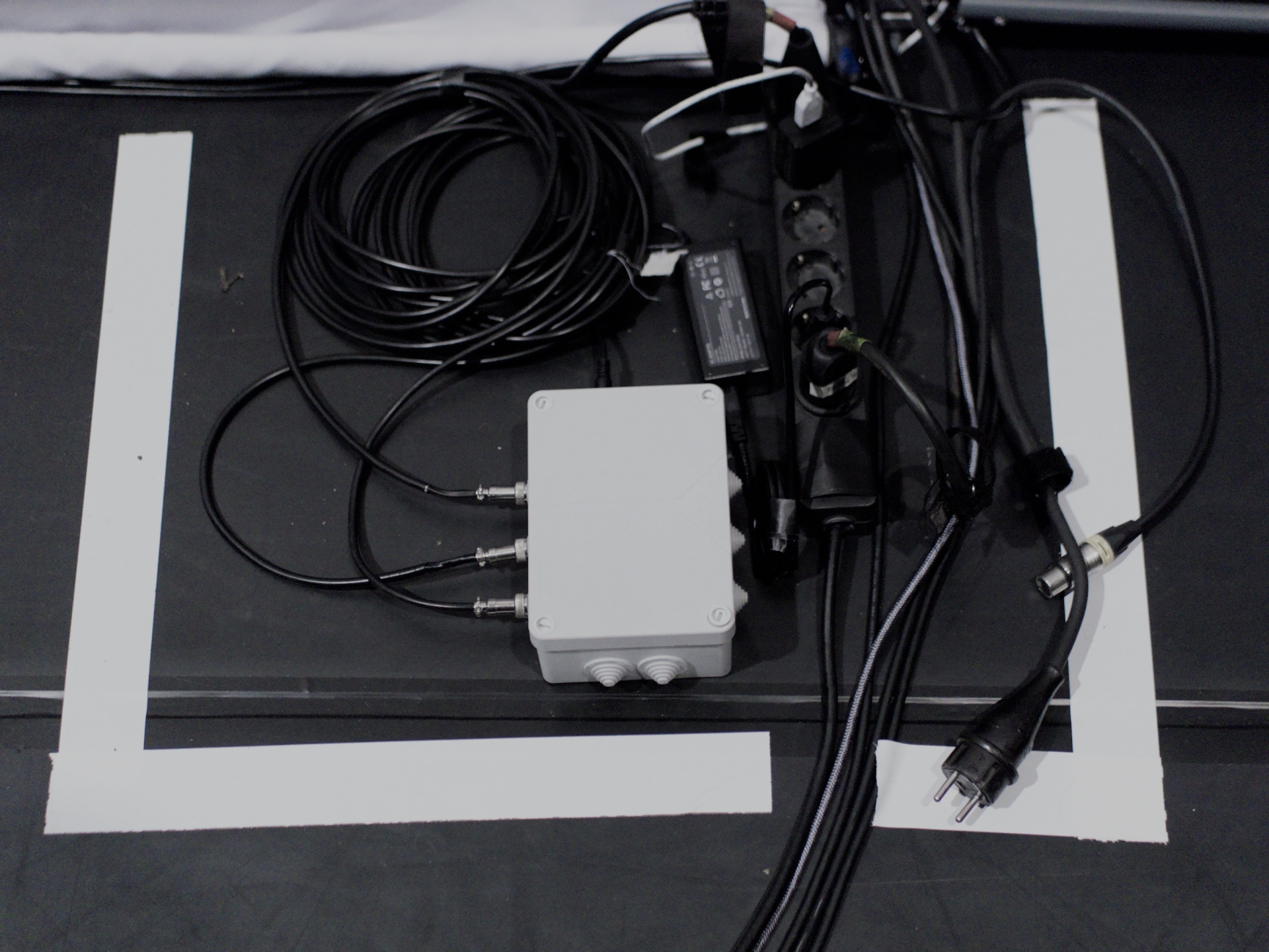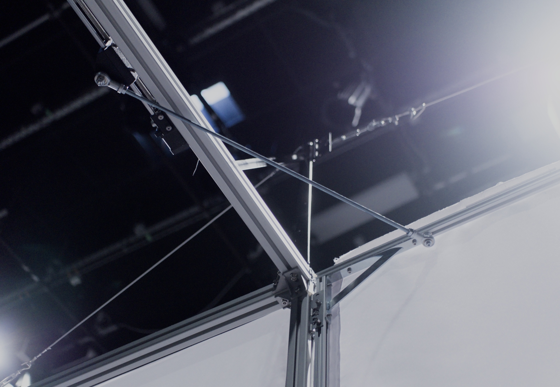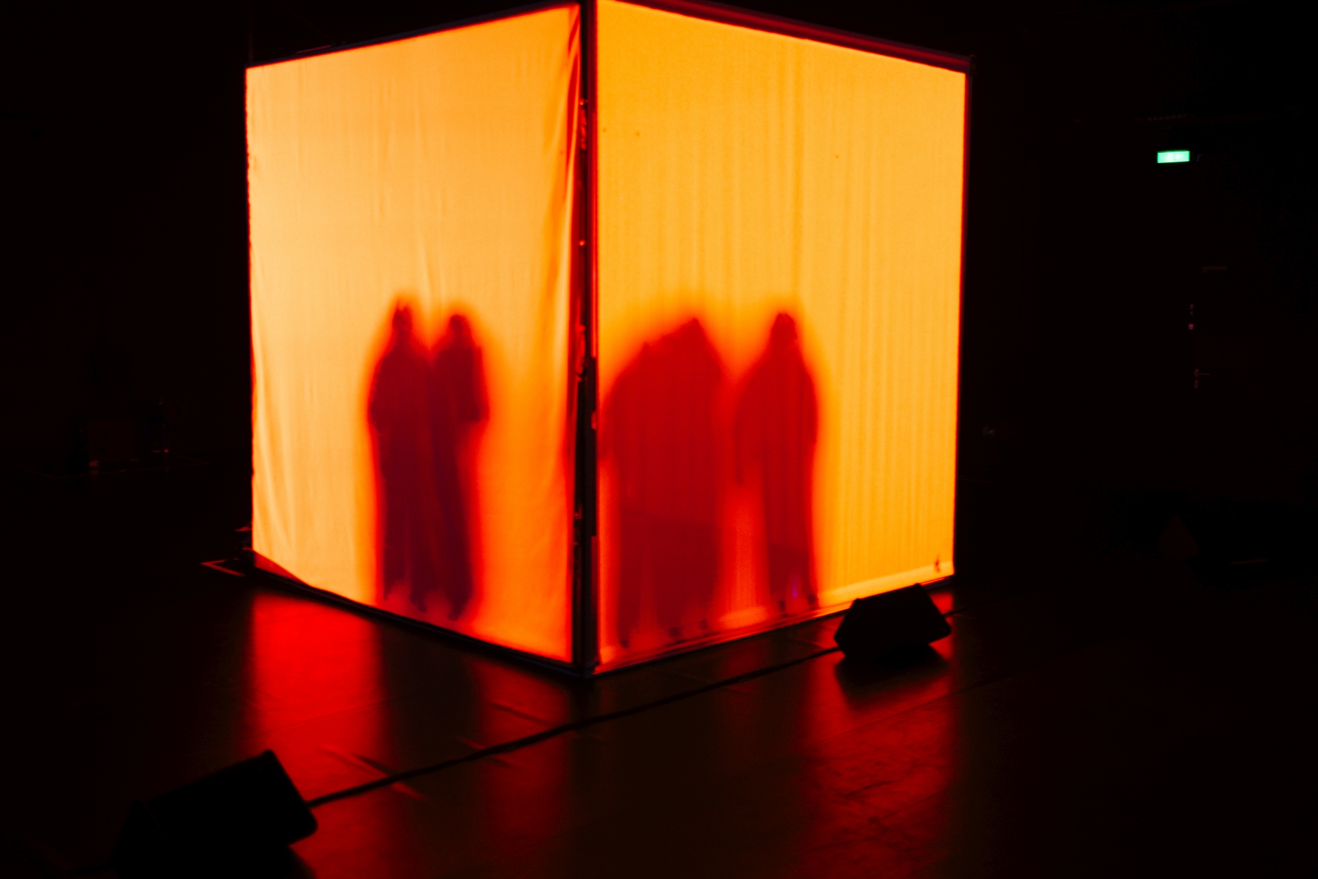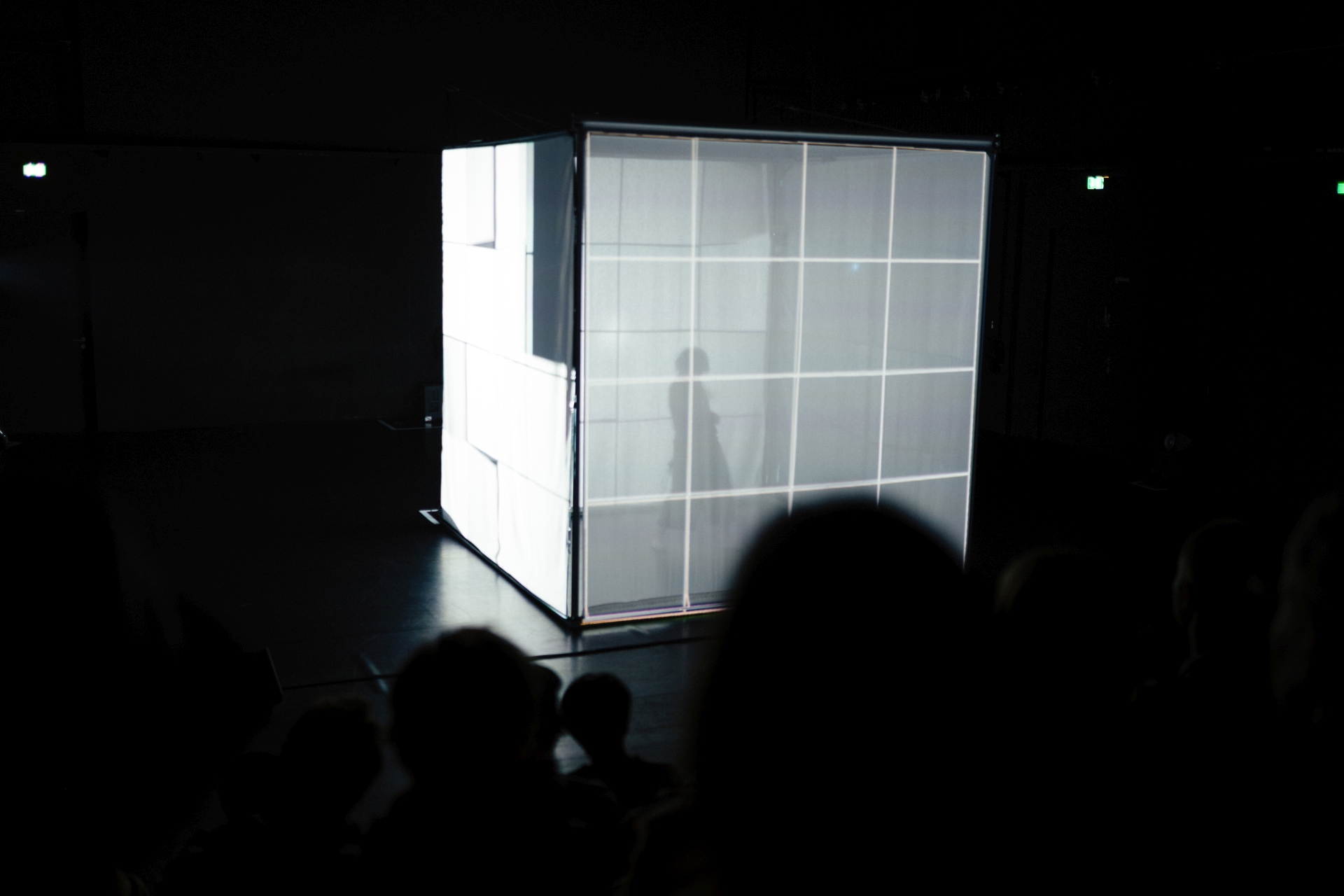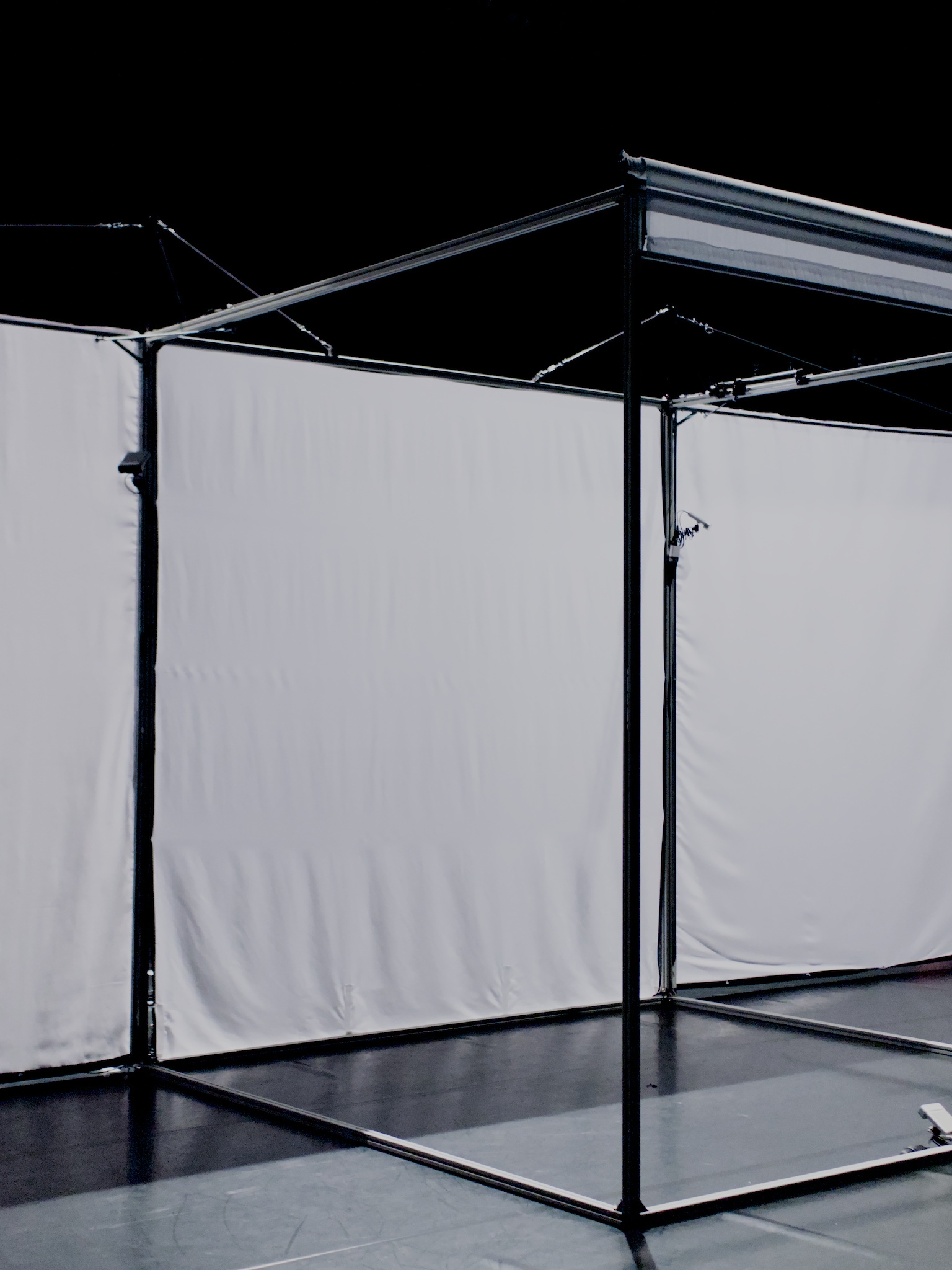 - Kinetic screen structure - semi-transparent, motorized cube (3x3m), opening/closing as an active scenographic gesture