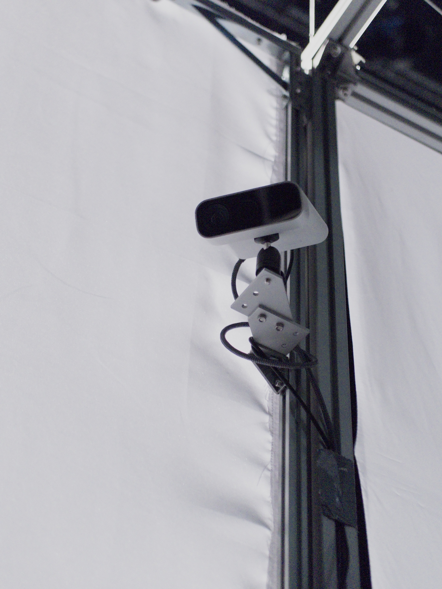 When closed, it frames the performer as if inside a controlled chamber - a space where observation and capture intensify.